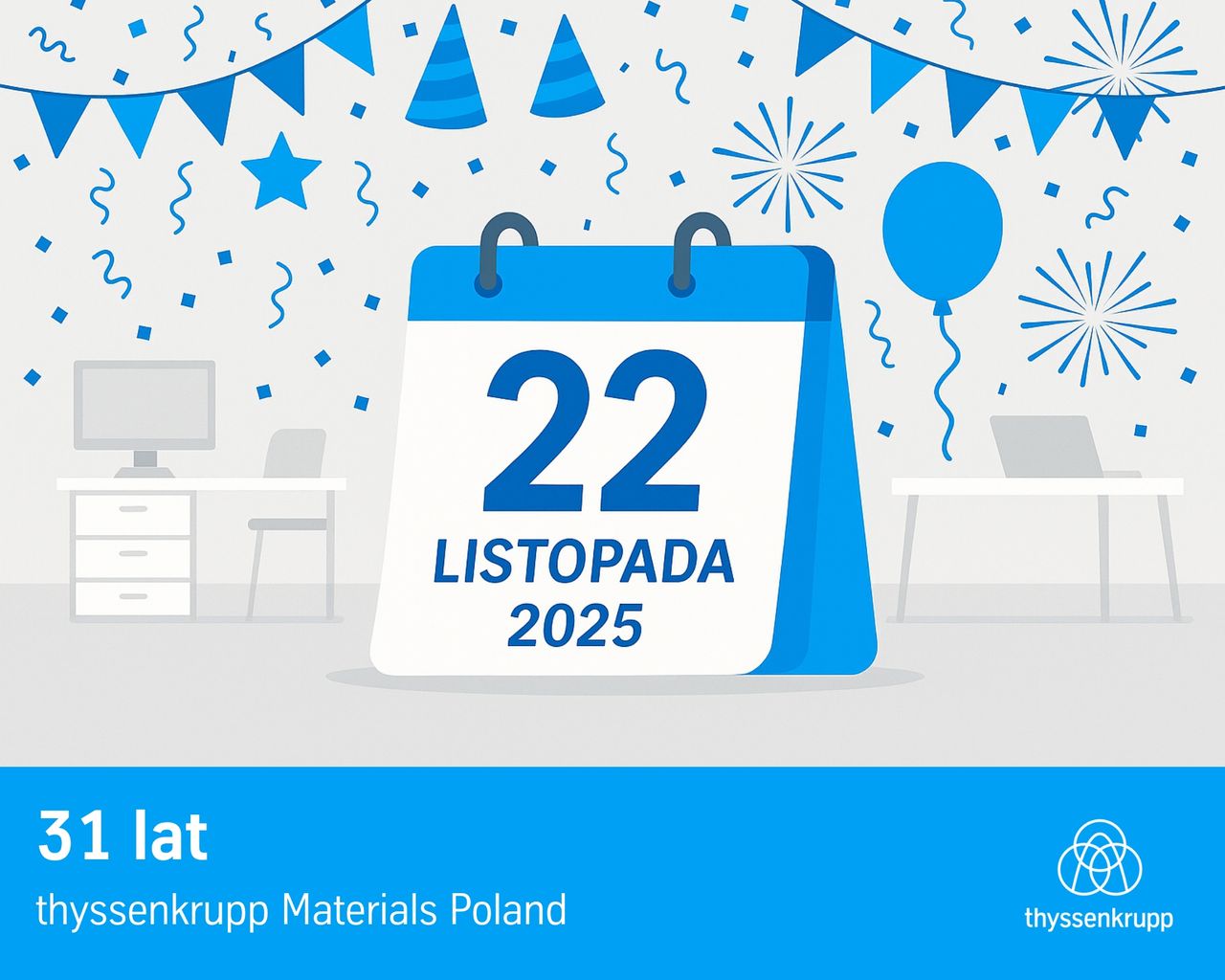 31 rocznica działalności thyssenkrupp Materials Poland – od ponad trzech dekad wspieramy polski przemysł, łącząc dystrybucję materiałów, zaawansowane usługi obróbki i przetwarzania oraz kompleksowe rozwiązania dla branży spawalniczej.